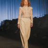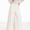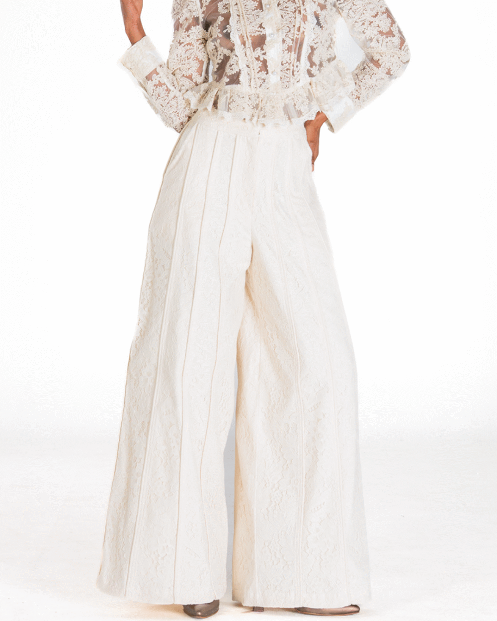 Destaca con elegancia atemporal con nuestro palazzo en encaje color habano. Confeccionado en un delicado tejido de textura floral, este pantalón de tiro alto realza la figura con una silueta fluida y sofisticada. Su diseño de bota ancha y costuras verticales estiliza visualmente, mientras que el forro interno proporciona comodidad y cobertura sin perder la ligereza del look.