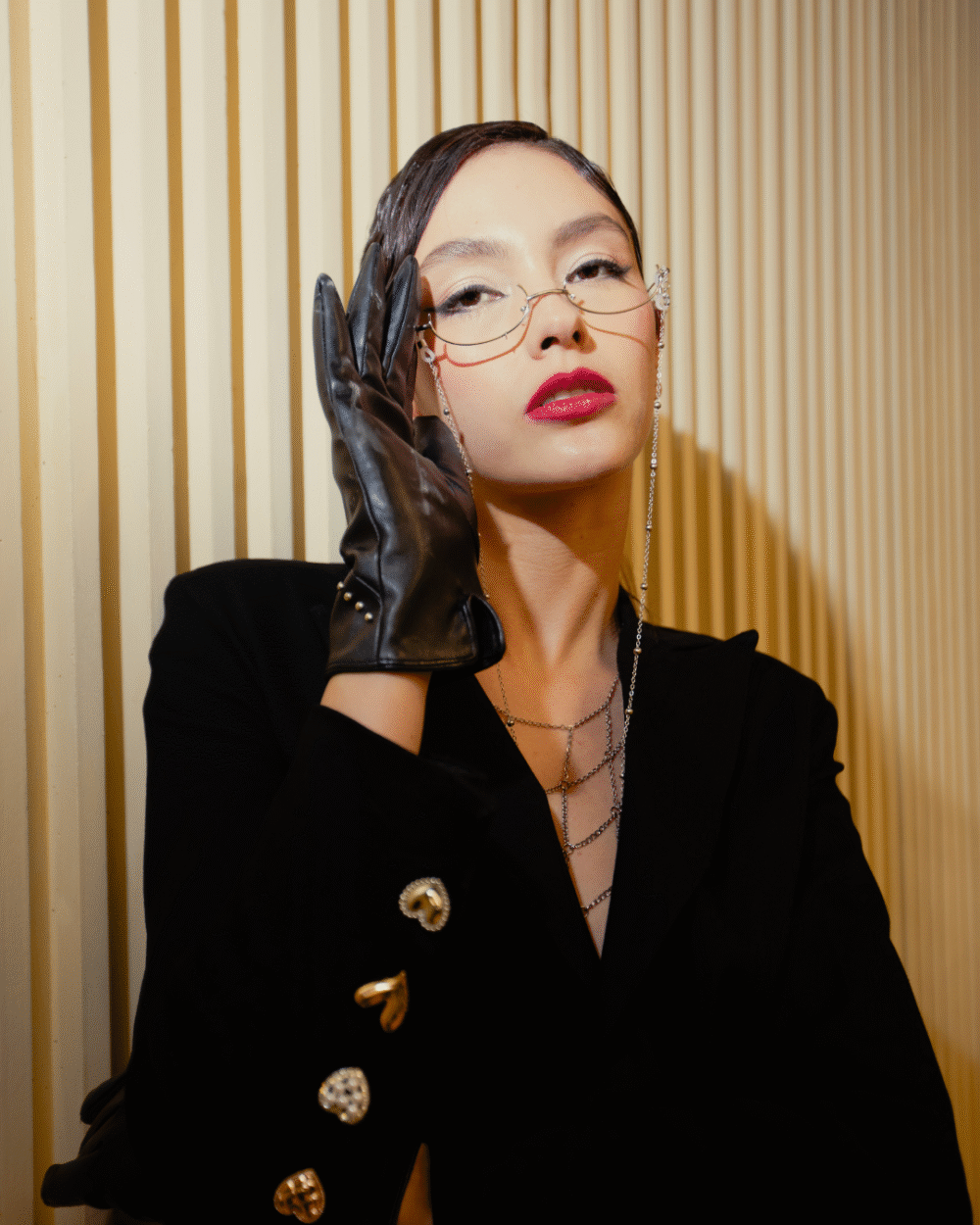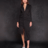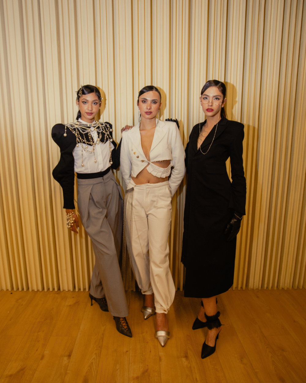 Denim black semilicrado con perfecta horma y apique en fleco macramé.